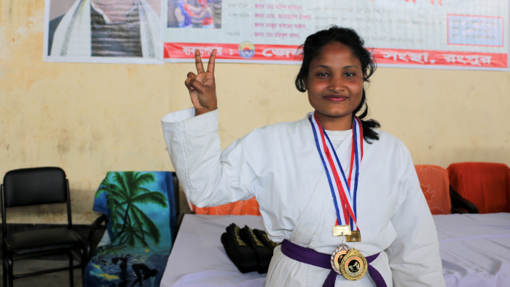 Als ihre Onkel versuchten, sie an einen älteren Mann zu verheiraten, widersetzte sich Gaitree. „Ich lehnte ab – meine Gedanken waren bei meinen Geschwistern und der Frage, wer sich dann um sie kümmern würde“, erzählt sie. Dass sie den Mut aufbringen konnte, bei ihren Onkeln einzufordern, ihren eigenen Weg gehen zu können, verdankt sie neben ihrer starken Willenskraft auch der Teilnahme an einem Projekt von Plan International im Jahr 2014. In dem Projekt, das Mädchen in ihrem Selbstvertrauen stärkt und ermutigt, die in der Gesellschaft verankerten Geschlechtsstereotypen infrage zu stellen, entdeckte Gaitree ihre Leidenschaft für Karate. „Das hat mein Leben verändert“, sagt die 24-Jährige. „Ich wurde sogar für einen sechsmonatigen Fortgeschrittenenkurs in Dhaka ausgewählt.“