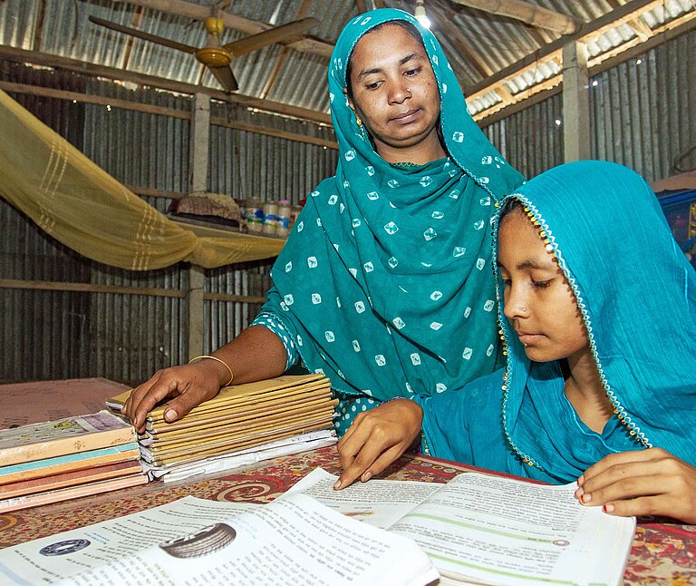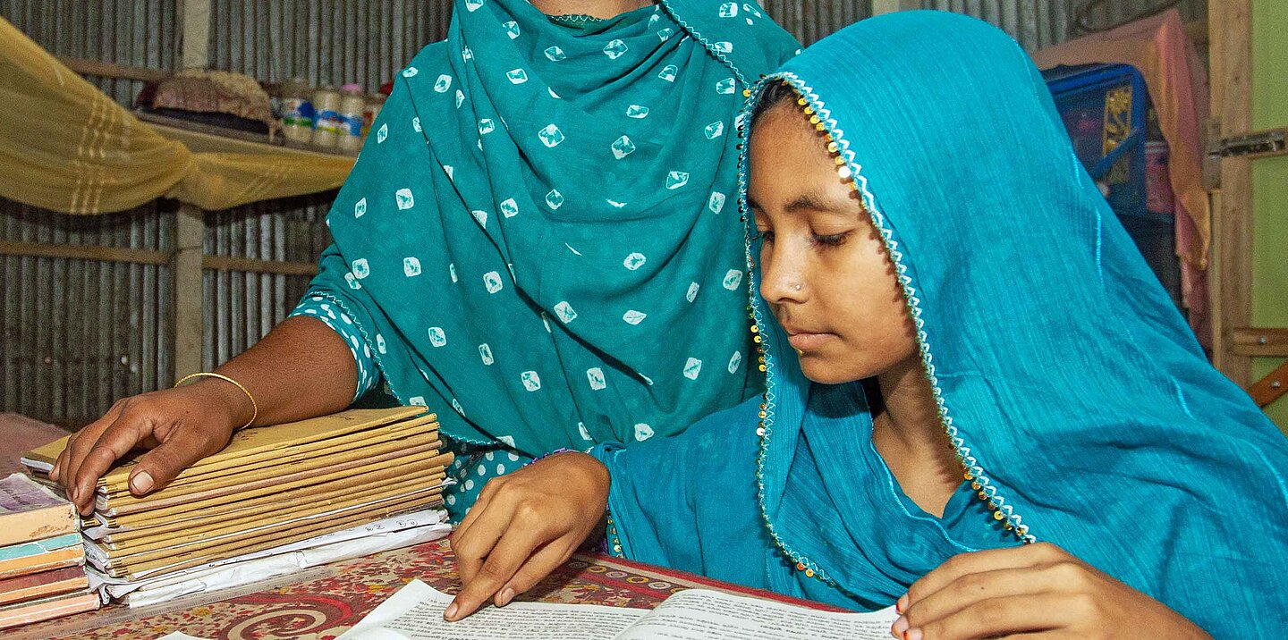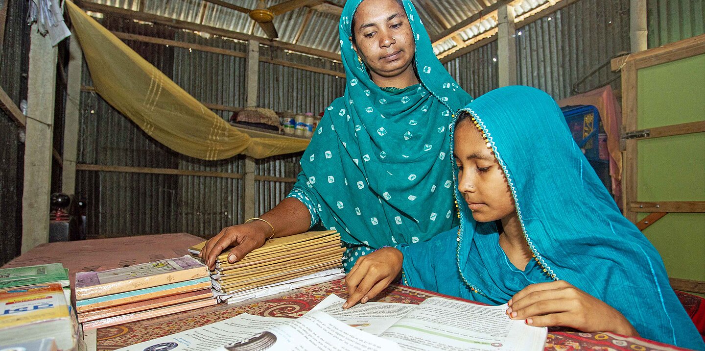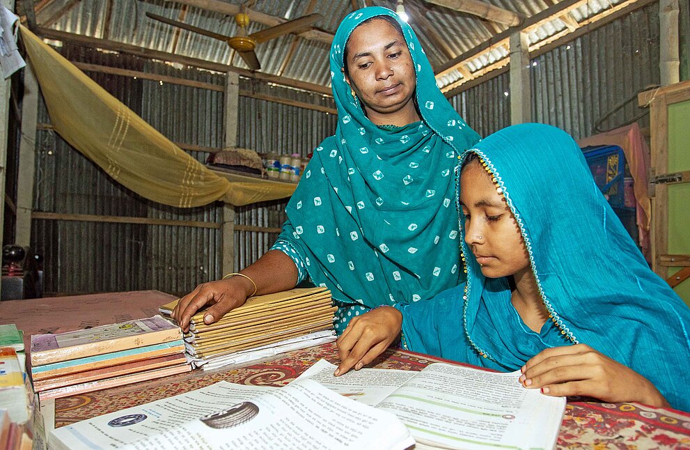 Das Plan-Projekt „Child, Not Bride“ wird in einigen der am stärksten benachteiligten Distrikten von Bangladesch durchgeführt – in Regionen, in denen Armut, Katastrophen und soziale Normen insbesondere Mädchen anfällig für Frühehen machen. Und eine der hier Lebenden ist Aleynur, die entschlossen ist, dass ihre Tochter die Schule weiterbesucht und nicht früh heiratet. „Ich weiß, wie es sich anfühlt, wenn deine Träume plötzlich zunichte gemacht werden“, sagt sie. „Deshalb möchte ich, dass Sumaiya Arbeit findet, Krankenschwester wird. Ich werde alles tun, was ich kann, um ihr dabei zu helfen.“