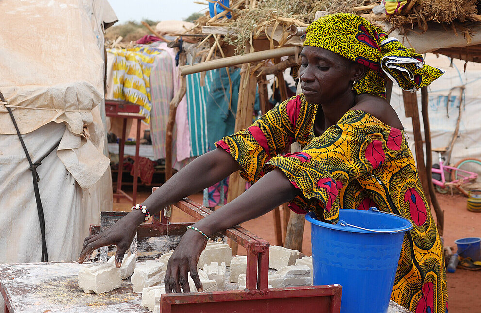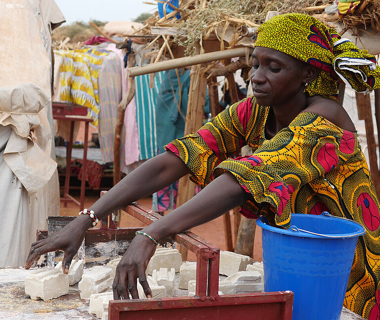 Seife und Waschmittel werden im Camp von jedem Haushalt im täglichen Leben verwendet, daher ist die Nachfrage groß und Hamssetou hat einen festen Kundenstamm: „Ich verkaufe die Seife jeden Tag, ich laufe durch das Camp und verkaufe sie an die Frauen, die ich kenne. Mit dem Gewinn aus dem Seifenhandel sorge ich dafür, dass meine Kinder essen und zur Schule gehen können.“ In dem Camp hat sich mittlerweile eine Kooperative von Seifenverkäufer:innen gebildet, deren Mitgliedsbeitrag Hamssetou wöchentlich bezahlt.