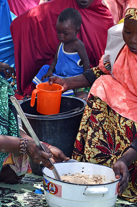 Die Kochdemonstrationen der Mamans Lumière sind ein zentraler Bestandteil eines Projekts von Plan International, das die Ernährungssituation in der krisengeprägten Tschadsee-Region verbessern soll. Sie besuchen Gemeinden in der Region Diffa in Niger und zeigen Frauen, wie sie nahrhafte, vitaminreiche Mahlzeiten zubereiten können. Heute steht ein angereicherter Porridge auf dem Programm – eine Mischung aus lokal verfügbaren Zutaten wie Erdnüssen, Hirse, Bohnen, Soja und Milch.