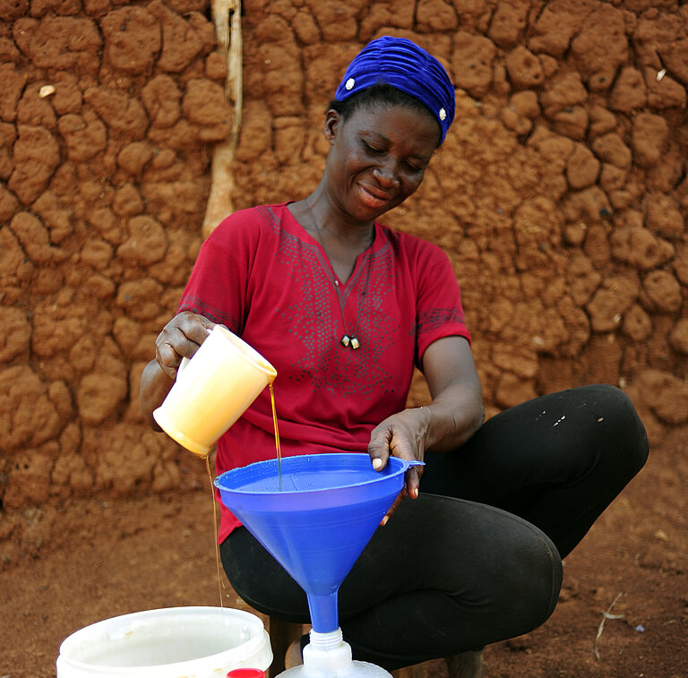 Nach der Schulung wurde Gifty beim Aufstellen ihrer eigenen Bienenstöcke unterstützt, damit sie Honig produzieren und ein Geschäft aufbauen kann. Inzwischen kommt sie auf 90 Kilo Honig pro Jahr. Sie verkauft ihr Bio-Produkt auf dem örtlichen Markt und an Student:innen einer nahe gelegenen Universität und verdient damit rund 8.400 GHS (umgerechnet 1.282 US-Dollar) pro Jahr.