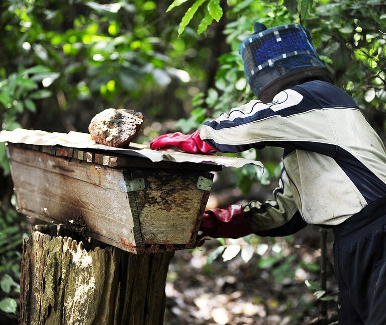 Die Imkerei hat das Leben meiner Familie verändert. Vor ein paar Jahren konnte meine Familie kaum zwei Mahlzeiten am Tag essen, meine Kinder mussten die Schule verlassen, weil ich ihr Schulgeld nicht bezahlen konnte. Heute bin ich stolz, dass wieder alle meine Kinder den Unterricht besuchen können.“