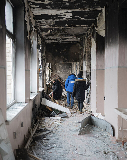 Ludmila, die unerschütterliche Schulleiterin, führt eine Delegation von Plan International durch das verkohlte Gebäude und zeigt die Zerstörung auf: Hier befand sich vorher ein kleines Museum, dort die Turnhalle der Schule. Der Boden ist mit Glasscherben übersäht, die Wände sind vom Feuer geschwärzt. In einem der Klassenzimmer türmt sich, was einmal Schulpulte waren – jetzt sind nur noch die Metallrahmen übrig, da die Flammen die hölzernen Tischplatten verschlungen haben.
