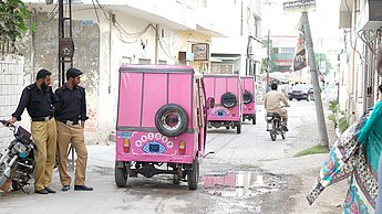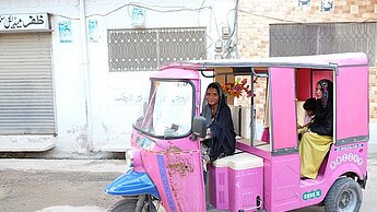 „Für mich ist es eine Ehre, Fahrerin einer pinken Rikscha zu sein. So kann ich meinen Beitrag zur Veränderung der Gesellschaft leisten“, erzählt Najm stolz. Durch den Frauen-Rikscha-Service verhilft Plan International Pakistan Frauen zu mehr Freiheit und Unabhängigkeit - sie können sich nun sicher im Straßenverkehr bewegen.