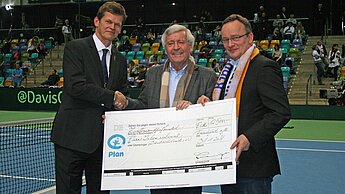 Zwischen den beiden Freitagsspielen überreichte Ulrich Lange, Präsident des Württembergischen-Tennisbunds zusammen mit dem Präsidenten des DTB, Karl-Georg Altenburg, dem Wolfgang Porschen, in der Geschäftsführung von Plan International Deutschland zuständig für Sportkooperationen, einen Spendenscheck in Höhe von 12.500 Euro.