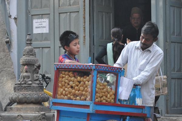 In den Gassen rund um dieses Familienheim tobten nachmittags die Kinder aus der Nachbarschaft. Ihr Lachen schallte bis hinauf in die 5. Etage, wenn sie mit den Straßenhunden spielten, hölzerne Kreisel drehten oder Papierdrachen steigen ließen – und damit die allgegenwärtigen Krähen aufscheuchten, die in das goldene Licht des aufkommenden Abends flatterten. Die Sorglosigkeit, die sich in Kathmandu manchmal in fast kitschigen Bildern zeigte, nährten fliegende Händler: Popcorn, Mandeln, Zuckerwatte – die Gassen Kathmandus erwiesen sich als kulinarisches Schlaraffenland. Wenn man das nötige Kleingeld hatte.