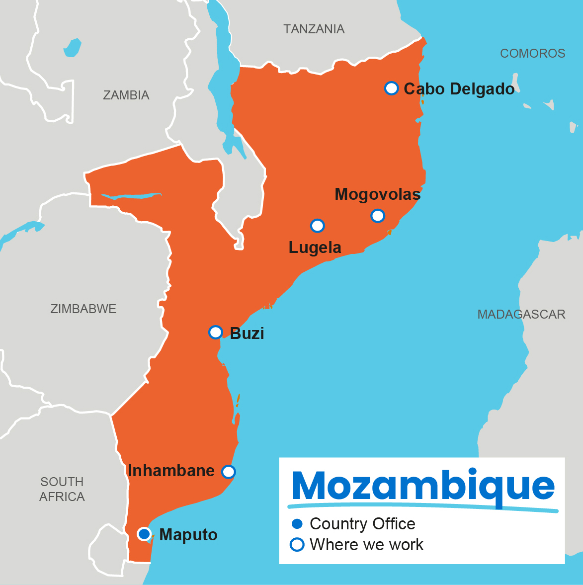 Mosambik liegt im Südosten Afrikas und hat eine Küste am Indischen Ozean. Die Landschaft ist geprägt von Hügeln, Hochebenen, bergigem Hochland und dem großen Fluss Sambesi. Die offizielle Landessprache Mosambiks ist Portugiesisch. Außerhalb der Städte werden jedoch häufiger indigene Bantusprachen, wie beispielsweise Makhuwa, gesprochen. Plan International arbeitet seit 2007 in Mosambik, insbesondere für und mit Mädchen und jungen Frauen. Helfen Sie mit Ihrer Spende, die Lebenssituation für die Kinder und Familien zu verbessern.
