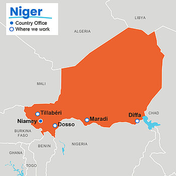 Niger ist ein Binnenstaat in Westafrika, der an Nigeria, Benin, Burkina Faso, Mali, Algerien, Libyen und Tschad grenzt. Wüstenebenen und Sanddünen machen einen Großteil des Landes aus. Die Wirtschaft von Niger ist auf Landwirtschaft, Viehzucht und einige der größten Uranvorkommen der Welt ausgerichtet. Der Islam ist die am weitesten verbreitete Religion und es gibt insgesamt zehn Landessprachen. Plan International arbeitet seit 1998 in Niger, insbesondere für und mit Mädchen und jungen Frauen. Helfen Sie mit Ihrer Spende, die Lebenssituation für die Kinder und Familien zu verbessern.