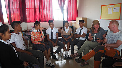 Als Erstes besichtigten wir die Kita, in welche auch unser Patenkind ging. Wir wurden dort sehr herzlich empfangen und beantworteten viele Fragen der Kinder. Als Nächstes wurden wir mit einem geschmückten Lastenmotorrad durch das Dorf gefahren und dem Bürgermeister und dem Schuldirektor und jeder Klasse der Schule vorgestellt. Anschließend gab es noch eine Gesprächsrunde mit den Schülern der oberen Klasse zu denen auch 2 Geschwister von Carlos gehörten.