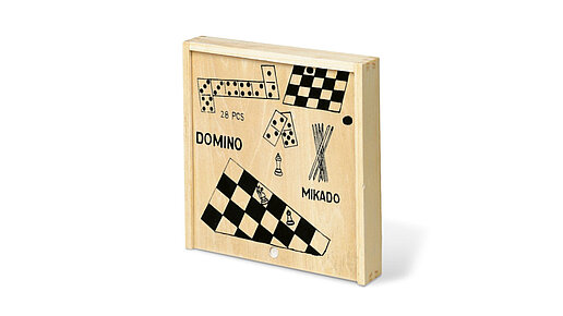 Vier Spiele in einer Holzbox: Mikado, Domino, Schach und Dame