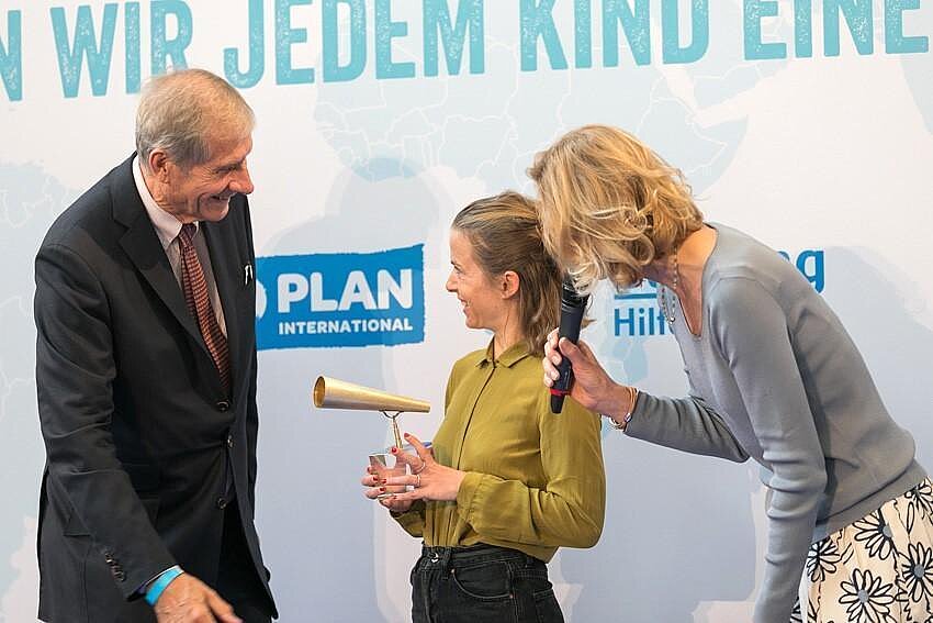 Schauspielerin und Plan-Patin Emilia Schüle erzählte, wie sehr es sie beeindruckt habe, als sie 2016 in den Philippinen in einem Plan-Projekt mit Jugendlichen sprach, die nach dem Taifun Haiyan zum Teil alles verloren hatten und sich nun für Klimaschutz einsetzen. „Kinder und Jugendliche werden viel zu oft unterschätzt“, sagte die Schauspielerin. Deshalb freute sie sich auch, den Mädchen aus Simbabwe den Sonderpreis überreichen zu dürfen.