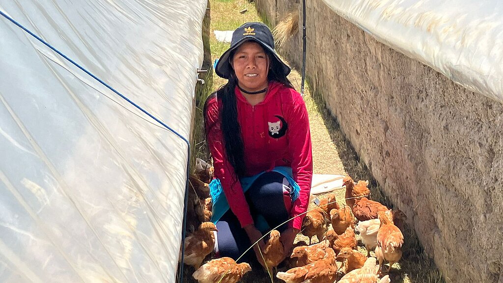 - Nach erfolgreicher Absolvierung einer Schulung erhält sie 30 Hühner.