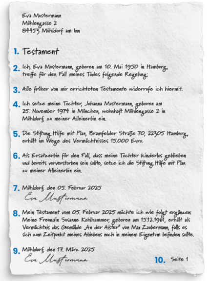 Anhand eines Beispieltestaments zeigen wir Ihnen, wie ein korrektes Testament aussehen kann. Es beinhaltet die Erbeinsetzung, Vermächtnisanordnung, Ergänzungen und Auflagen.